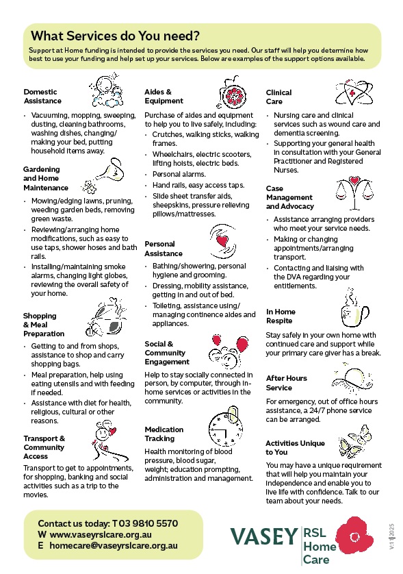 - Everyday living services: Assistance with cleaning, gardening, shopping, meal preparation, and respite care.